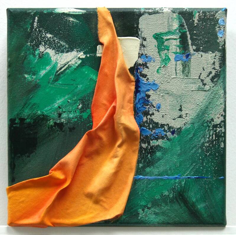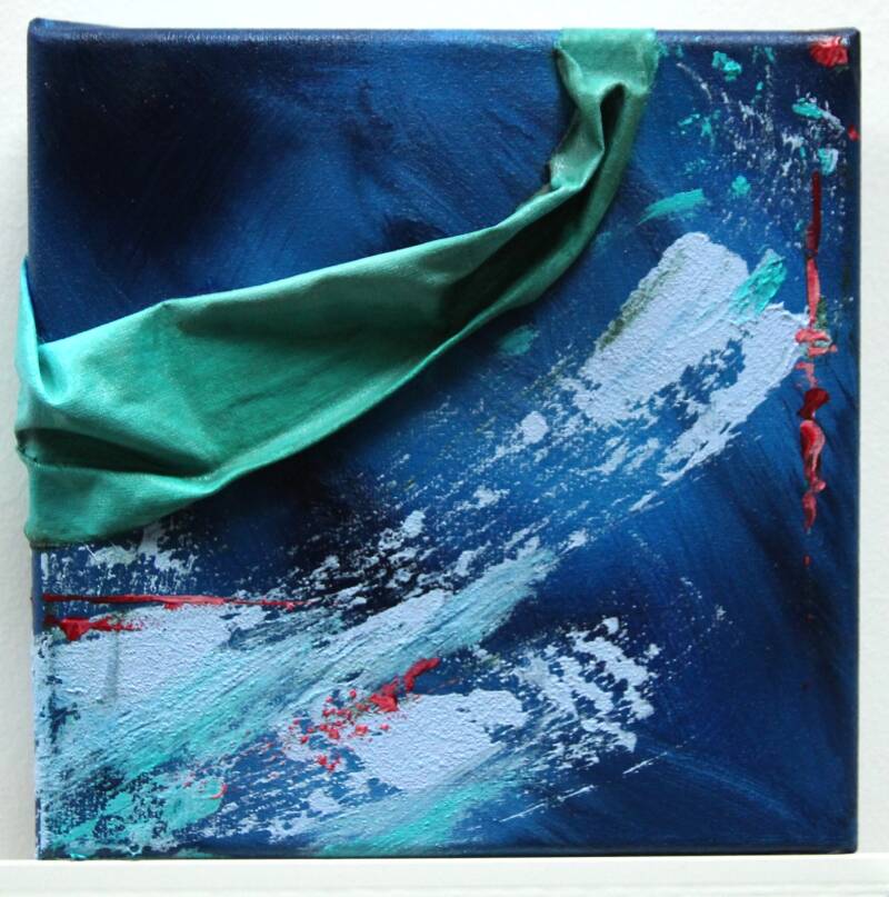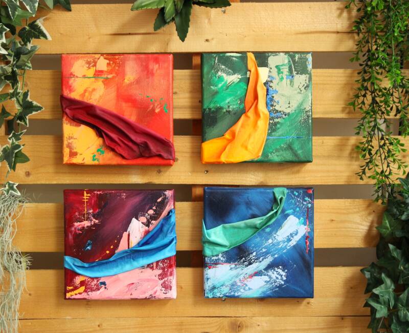 Door middel van stof is een 3D effect op het doek gecreëerd, dat is geschilderd in een goed combinerende kleur door de cirkel een kwartslag te draaien. Tot slot is op elk van de paneeltjes een klein kleuraccent aangebracht in een complementaire kleur. Zo vormen de werkjes zowel op zichzelf als in combinatie met elkaar een passend geheel en eenheid.